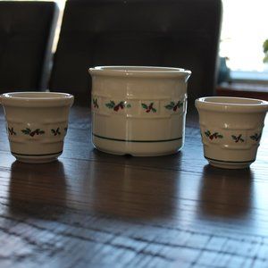 Longaberger Traditional Holly Crock and Candle Holder Set