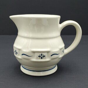 Longaberger Pottery Woven Traditions Classic Blue Creamer. Excellent pre-owned condition. 8 ounce, 4" tall, 2.75" across the top and just shy of 5" handle to spout.