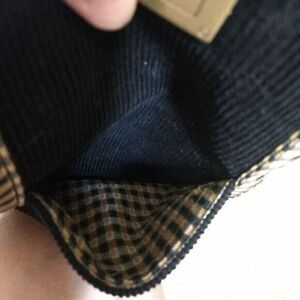 Small black corduroy bag with brown and black plaid handles. 7 x 9 x 4