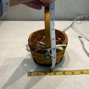 Approx 4" diameter at base, 4.5" diameter at top, 3" high basket with 3.5" handle for total 6.5" height.