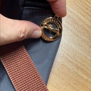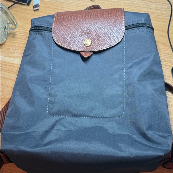 Stylish Longchamp backpack in Dark Grey! fabric. Features a brown leather flap. Perfect for everyday use. Like new excellent condition! Only used for few times.!