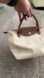 Cute Longchamp tote with beige body and brown leather accents. Features a gold zipper pull.