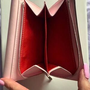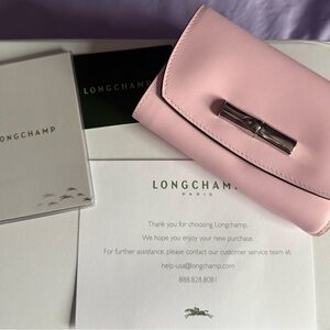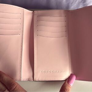 Elegant Longchamp wallet in blush pink. Features a metallic accent. Ideal for chic occasions.
