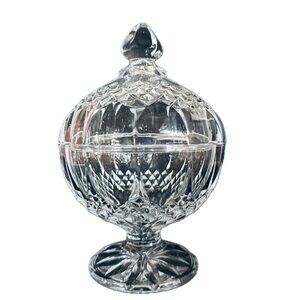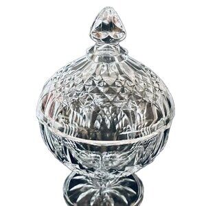 Longchamp Cut Crystal Footed Candy Dish w Lid Clear Geometric Pattern VTG '80s
