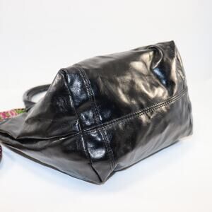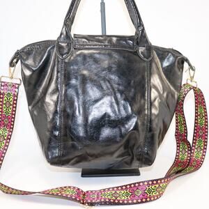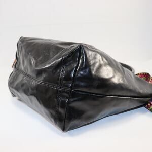 Authentic Longchamp Le Pliage Cuir leather tote in black. Features soft, glossy leather with silver logo hardware and an added colorful woven shoulder strap (non-branded replacement). Zip top with snap flap closure and brown fabric lining. Inside zip pocket and slip pockets. The zipper pull is detached but included. Clean interior and supple leather with light surface creasing from normal use.