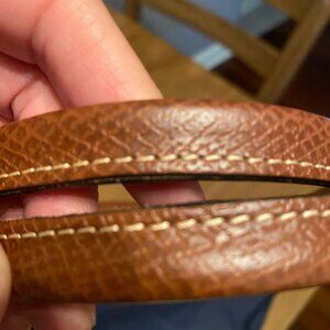Used once-in perfect condition. This is a great purse to travel with and carry around town. Two interior slip pockets, signature Longchamp zipper and snap closure, water resistant lining, gold hardware, very durable stitching, embossed leather trim, signature emblem on the front, double long handles-able to use as a shoulder bag, foldable design, nylon.