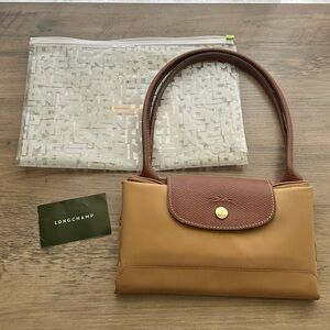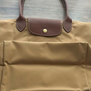 Longchamp Le Pliage Medium Nylon Shoulder Tote-Fawn with Brown Leather Handles