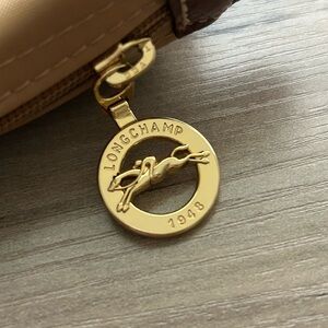 The bag features a durable, water-resistant nylon body with elegant leather handles and a snap closure flap. It is distinguished by its matching leather trim and snap, and the signature Longchamp horse embroidered in a contrasting color.