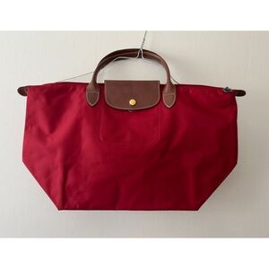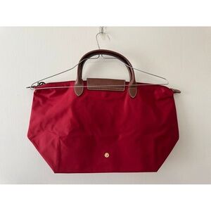 Chic Longchamp tote red. Features brown leather handles and flap. Ideal for everyday use.