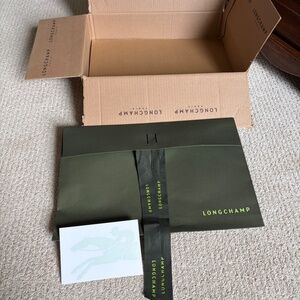 LONGCHAMP Le Pliage Tote Bag size Medium gift wrap packaging pouch and note card in the Longchamp Traditional Heritage Green color for birthday, holiday, Valentine's Day, Anniversary gift giving wrapping