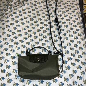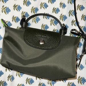 SOLD - Super popular Longchamp mini bag! It’s an olive green color with a neon green trim. Also including the strap that I bought separately to make it a crossbody. Perfect condition, no stains or tears. When sending an offer, please consider the previous sentence where I said that this bag is in perfect condition and heavily discounted compared to a brand new bag. Lowball offers will be denied.