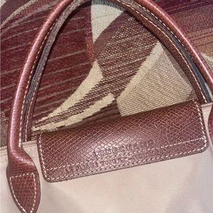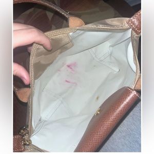 Tan Longchamp. Nail polish stains in the inside. Perfect condition otherwise! Stains aren’t noticeable unless digging through purse.