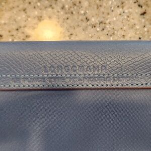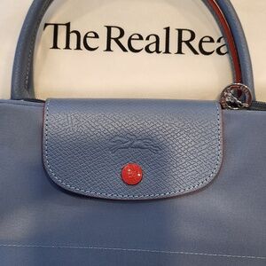 Unique color combination of denim blue/gray with orange/red details and silver tone hardware.