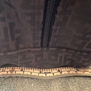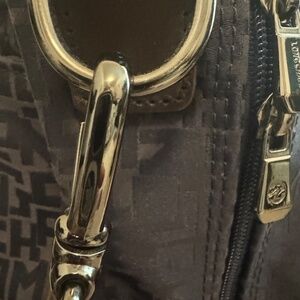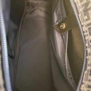 Rare find. Weekend overnight Longchamp travel bag in very good condition. Dark gray-blue - navy Longchamp printed heavy canvas like fabric with dark brown leather handles and leather and woven shoulder strap. Silver color metal fittings and navy lining. Top zip closure and zip pocket on back of case along with a loop so it can be "attached" to handles of a roller bag case. Also internal pocket with stud closure. ~16 width x ~10.5" height x ~6' depth. Light wear throughout - no damage or stains. Looks like the Le Pliage travel bag in design but much more robust in materials. From smoke free home.