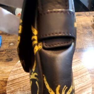 This Vintage Crossbody bag from Longchamp features brown leather adorned by a yellow dog Monogram pattern. The interior is lined with leather, has a zippered pocket, and has an interior slip pocket. the exterior has magnetic closure.