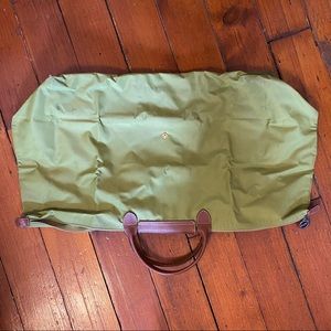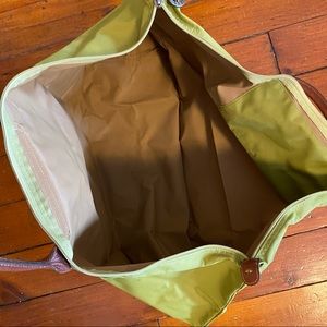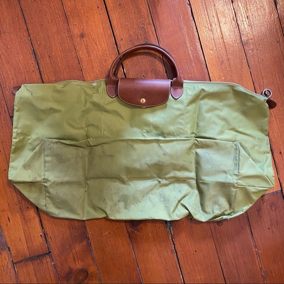 Longchamp Le Pliage weekender in pistachio green. In used condition. Some staining, particularly on bottom; I haven't tried to get these out.
