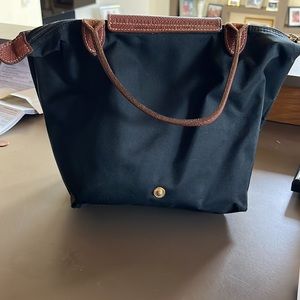 Black mini handbag with two leather handles and snap closure. The photos have the exact dimensions in it. Gold metallic hardware. Nylon bag with cowhide trim lightweight design folds up for ease during travel. Good condition.