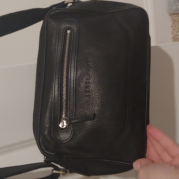 longchamp black pebbled leather camera bag style purse. two zip compartments. pocket outside. adjustable strap. #leather #crossbody