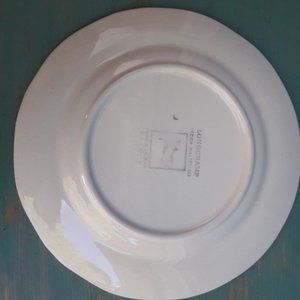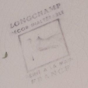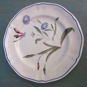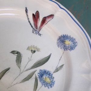 Longchamp plate Made in France Dragonfly Hand Painted in France Blue Flowers and a red rose bud Rare. Mark on bottom with signature letter off to side. Scalloped edge with blue trim. Red dragon fly for good luck. Good condition some slight crazing no chips nor ceacks. For salad hors douvres bread plate dish french porcelain.