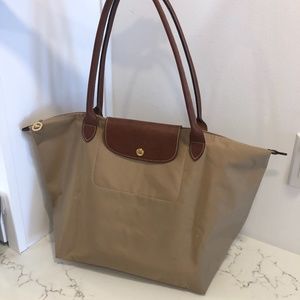 Authentic Longchamp Lepilage shopping Tan canvas with leather straps tote.