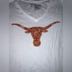 Featuring a white V-neck t-shirt featuring the Texas Longhorns team logo in a paisley pattern
