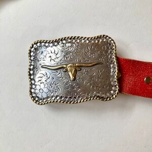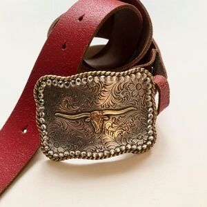 Longhorn Belt Buckle with Removable Red Distressed Leather Belt
