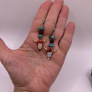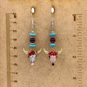 Cute western style earrings featuring longhorn cattle skull charms with turquoise beads, garnet glass beads and metal accent beads.