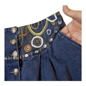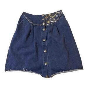 Add a touch of western flair to your wardrobe with this Longhorn blue denim skirt. The skirt is a size medium and features a geometric pattern with button closure and accents. It has pockets and is cut off, making it perfect for casual occasions in summer, fall, or spring. The skirt is made of a cotton blend material and is machine washable. This mid-rise skirt has a mini length and is designed for women. It is not handmade and is not a vintage item.