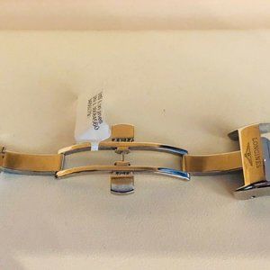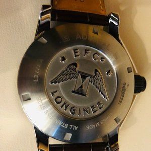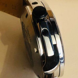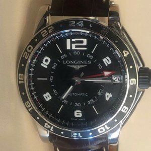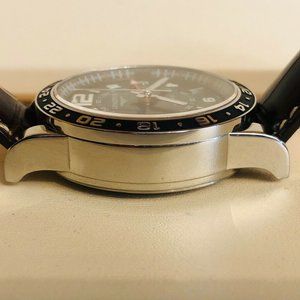Stainless steel case-42 mm with black leather strap and deployment buckle.Black dial with Arabic numerals.Black bezel with raised numbers for 2nd time zone.Display date window at 3 o'clock.Water resistant at 100 meters. Swiss made self winding movement.Luxury style watch.