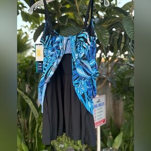NEW with Tags- 1pc swimsuit with a vibrant blue and black tropical print. Tummy Control Panel is the key to a more slimmer flattering Look.
