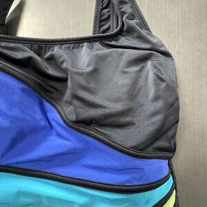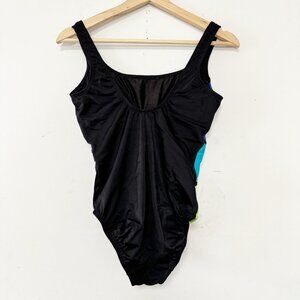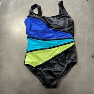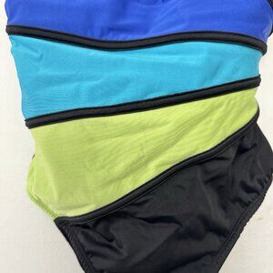 Longitude Swimwear One Piece Swimsuit Bathing Suit Black Retro Stripe Neon Green Blue Geometric