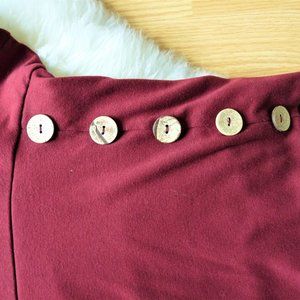 This cozy tunic is perfect for fall or winter! It has 2 pockets in the front with tan buttons. There are 5 tan buttons on the cowl neck.