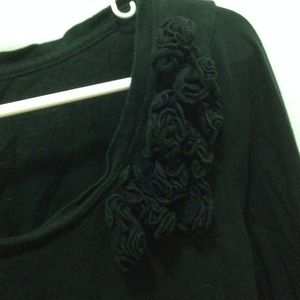 Thin material with a cute rose decal thing on the collar. Utilize the offer button!!