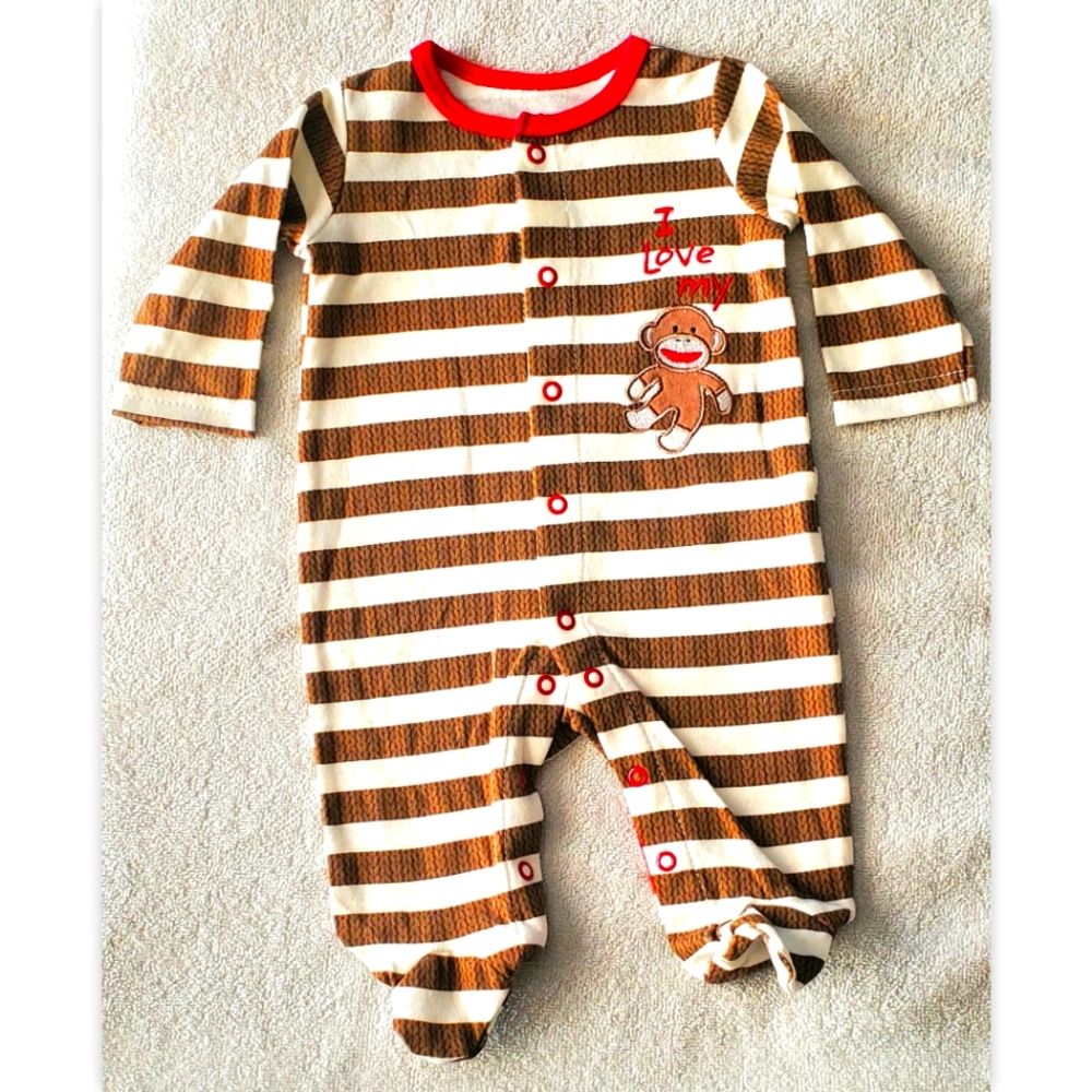 Brown & White horizontal stripes with Red accents on the collar & snaps. Words read "I love my" followed by the image of a monkey. Long-sleeved & closed feet