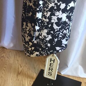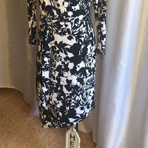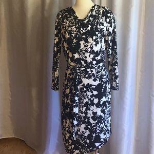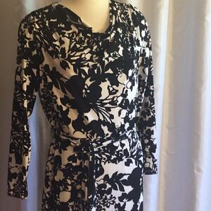 Ivory & black patterned dress with cowl neck, button at back of neck, pull on style, belted waist