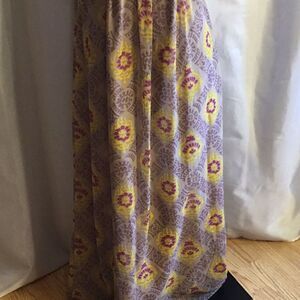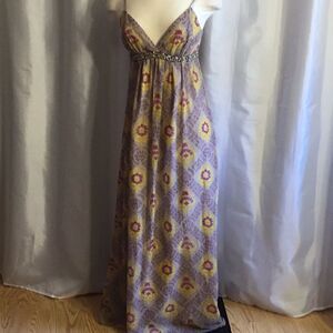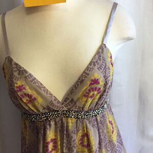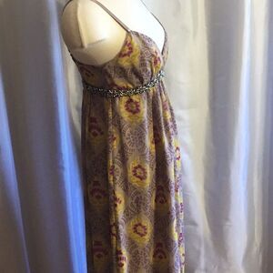 Sweet long dress by CHARLOTTE RUSSE in size medium. Fully lined, outer material is sheer pattern with a solid tan mater as lining. Adjustable straps. Back zipper. Beading & jewels at bust line. In new condition. Measurements are as follows: bust 30”, Waist 36”, hips 40”, dress length 53”.