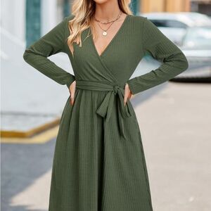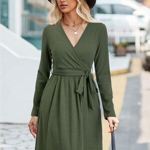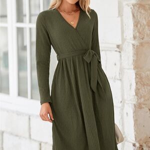 Women’s casual dresses is modest, ribbed knit; fall outfits for women 2024; sweater dress; V Neck; long sleeve; tie waist belted; midi dress.