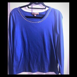 Royal blue long sleeve top by Elaine Tracy with detailed collar.