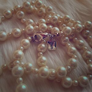Long off white pearl necklace. Pearls separated by smaller pearls. Silver clasp in the back.
