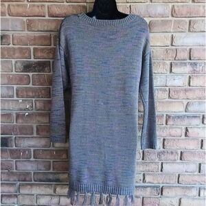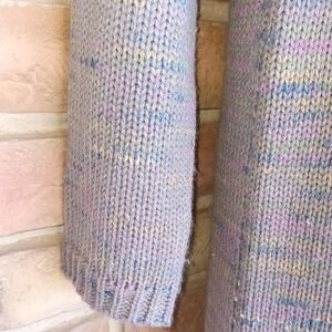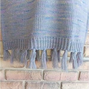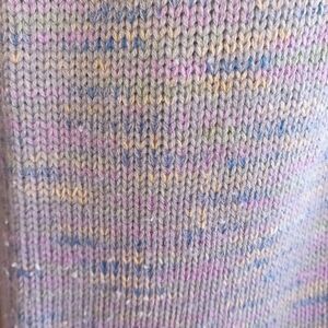 this sweater has several colors in it...base color is gray w blues , purple, green , pinkish, and yellow . measures 17 inches pit to pit. about 32 inches overall length w out the fringe at the bottom. does have some pilling, is in pre-owned used condition, bundle and save