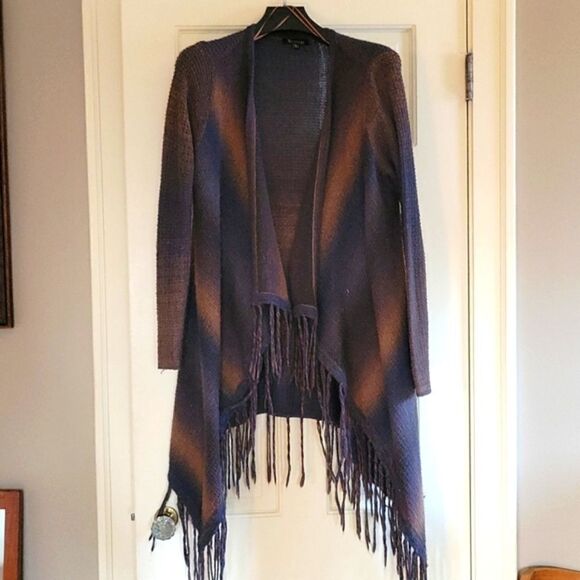 Sisters brand sweater. Mixed blue and rust ombre tones. It has a waterfall front and is fringed all around.