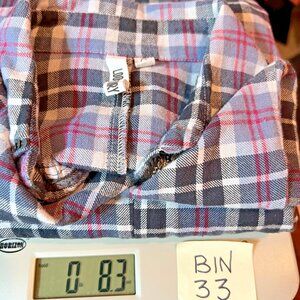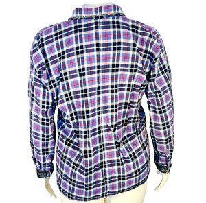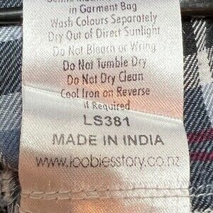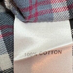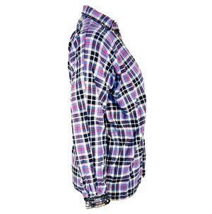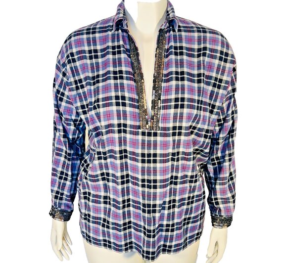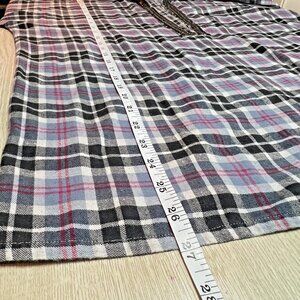 This Loobie's Story Flannel Shirt for women in generouly sized small features a light blue, red, black & white plaid pattern with bronze sequined accents on the cuffs and collar. This relaxed fit button-up shirt has a deep V-neckline and long sleeves, making it perfect for casual occasions, parties, or travel. Made from 100% cotton flannel, this tunic-style top is accented with sequins and is ideal for the winter, fall, and spring seasons. The glamorous cabin core theme adds a touch of style to this cozy and chic piece by Loobie's Story. Fit: Oversized, see measurements. EUC. Measurements: 24" armpit to armpit and 27" length. Please verify these are larger than your own to ensure it fits. Dress form is a size 12 with a 38” bust. MSRP $329. Like New.