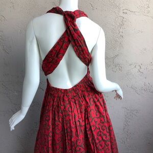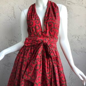 This stunning red halter dress features a beautiful pattern, perfect for any occasion. The elegant design and vibrant color make it a standout piece in any wardrobe.