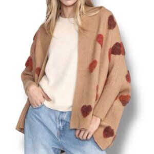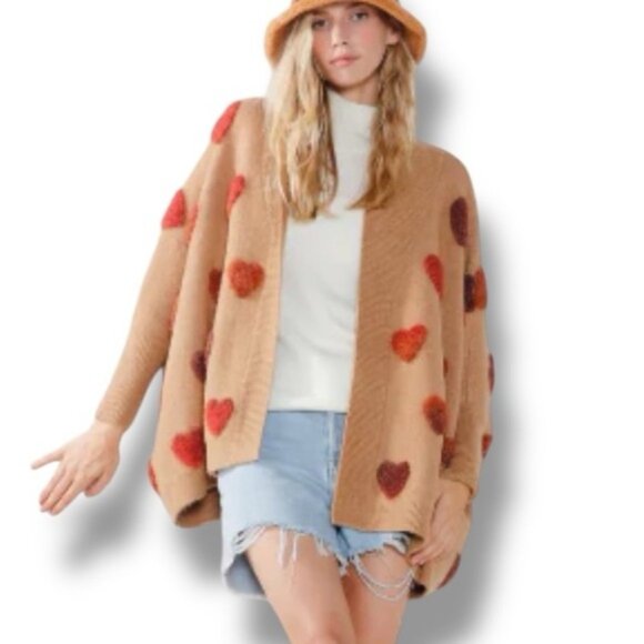 Stylish tan cardigan featuring charming red heart designs. Ideal for adding warmth and flair to any outfit.