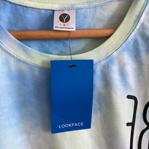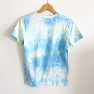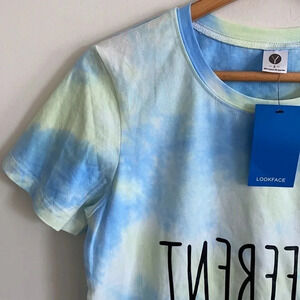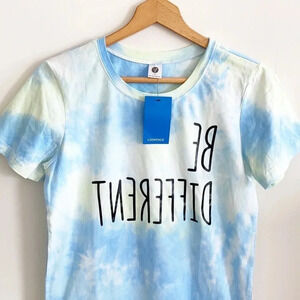 Buttery soft (think legging material) short sleeve tee. Tie dye. Says “be different” backwards on front. Blue, yellow, and white. Made with cotton and spandex. No flaws, new with tags