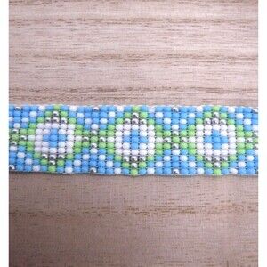 Bracelet is hand beaded using a loom. Made with teal, light green, white and silver Czech glass beads.