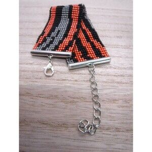 Bracelet is hand beaded using a loom. Made with black, orange and gray colored Czech glass beads.