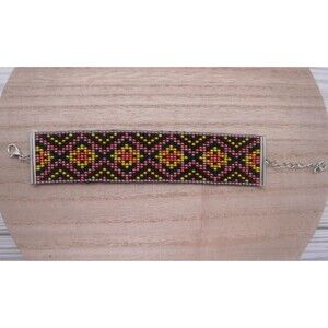 Bracelet is hand beaded using a loom. Made with black, yellow, pink and purple Czech glass beads.