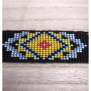 Bracelet is hand beaded using a loom. Made with black, yellow, purple, blue, silver and red Czech glass beads.