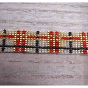 Bracelet is hand beaded using a loom. Made with ivory, black, red and gold Czech glass beads in a plaid pattern.